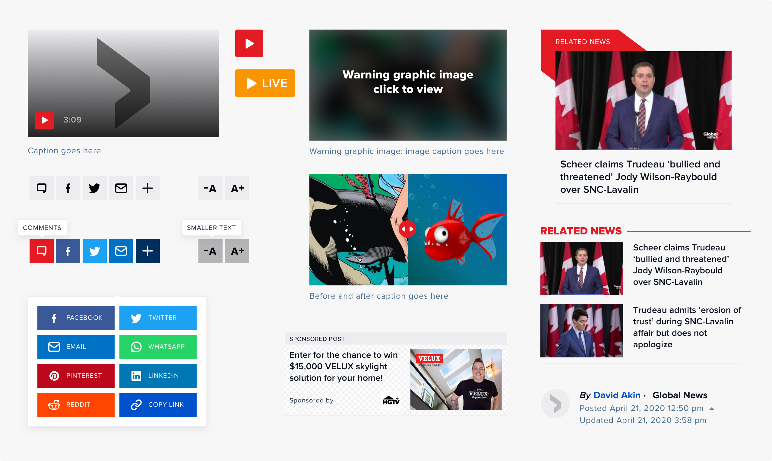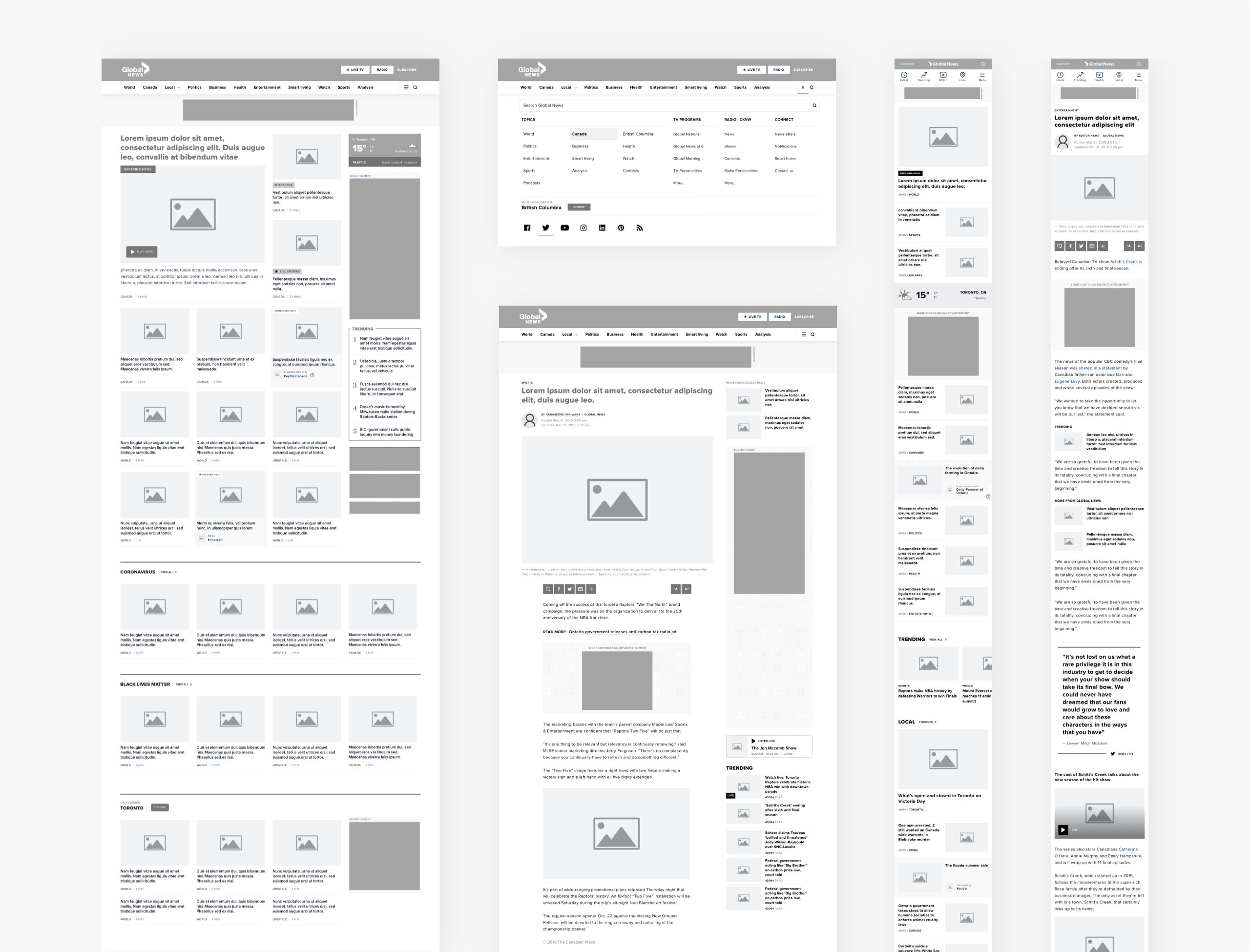 Once we had the wireframes ready we moved into designing the new experience for Global news website. Making sure we followed the existing styleguide created for the broadcast presence, we made a few changes to make sure we adhere to the minimum AA accessibility standard.