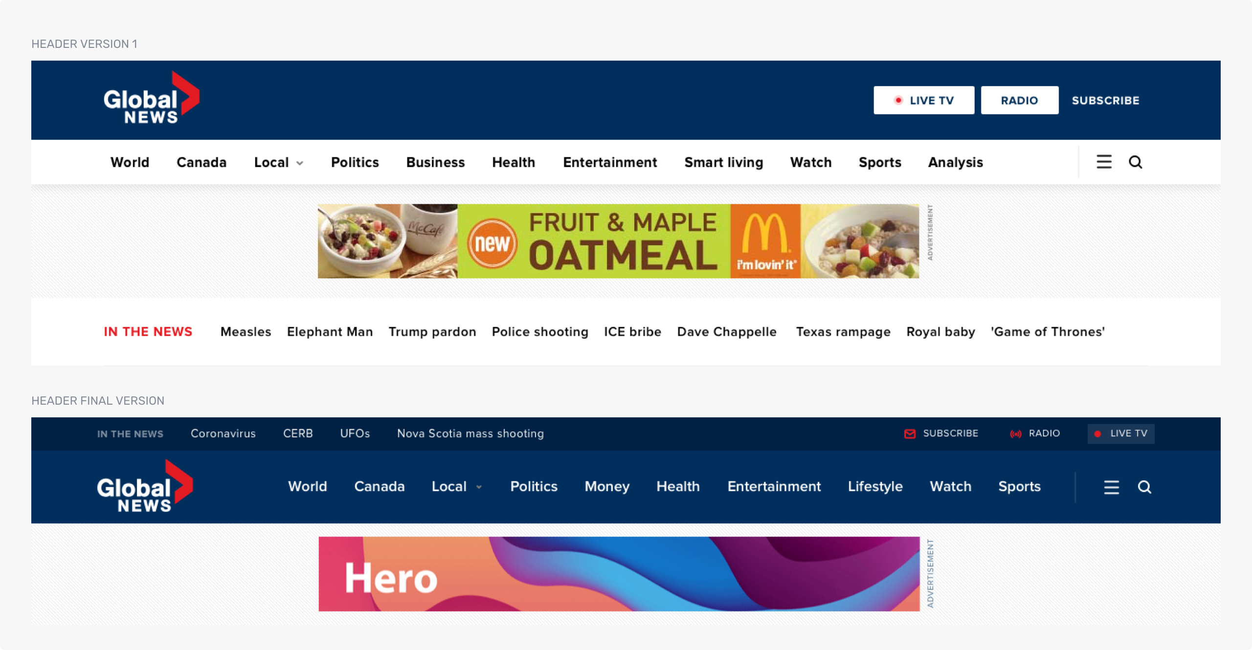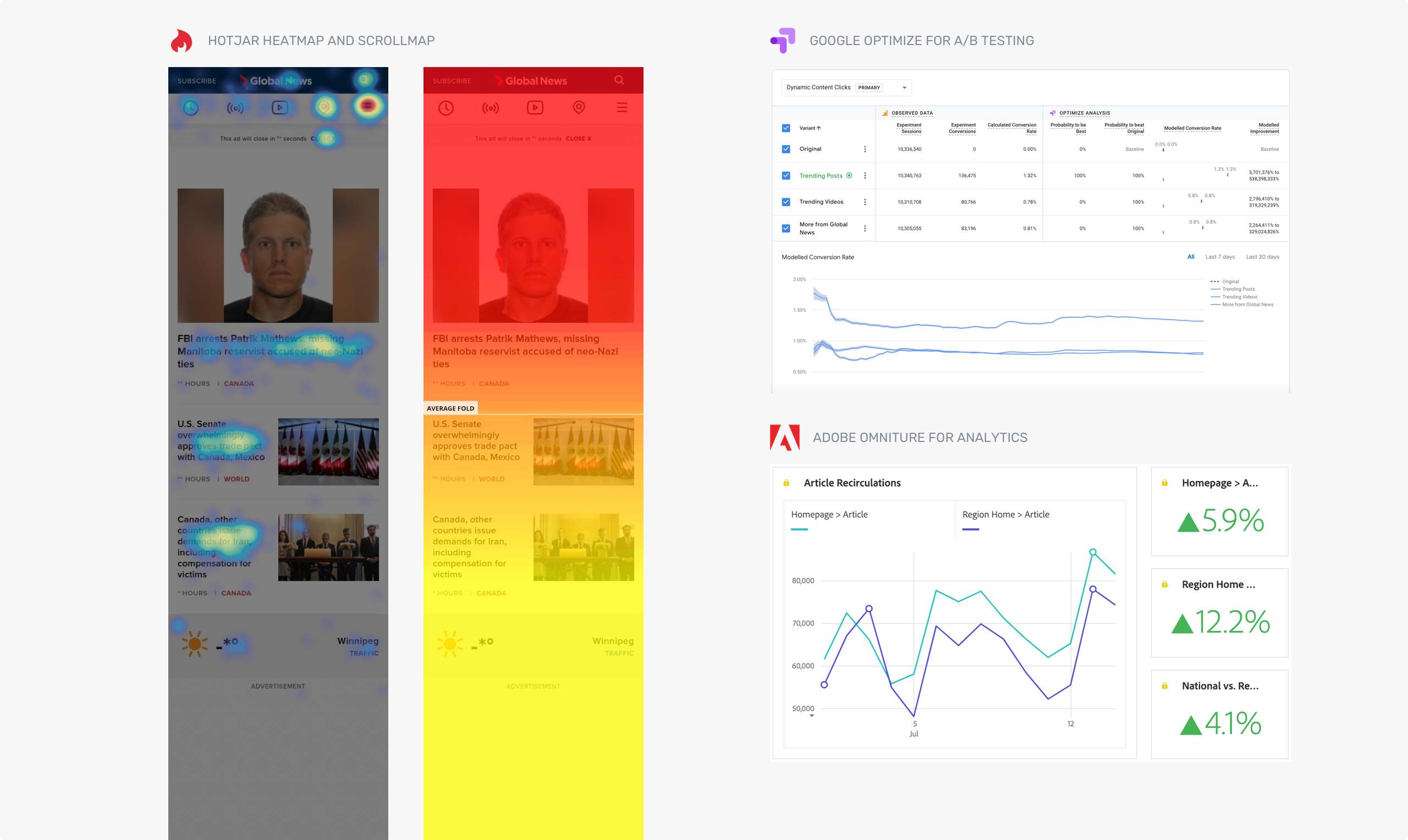 Being the 2nd best news website in Canada with 21 local newsrooms and a national reporting desk, 7 AM radio stations and several more FM stations Global News aspired to be the best in the country. Their aim was to improve the overall user experience of the site as well as grow and retain the audience by building trust.
